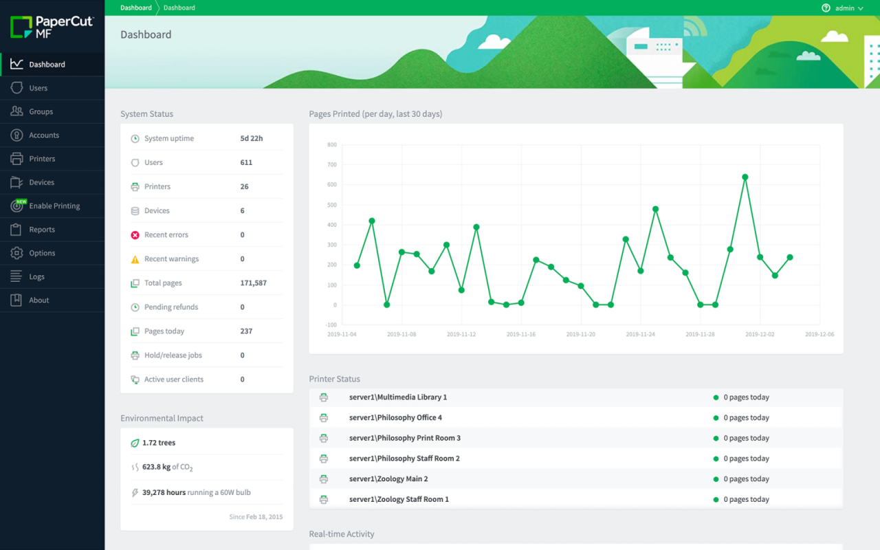 Góp phần bảo vệ môi trường và giảm chi phí in ấn với PaperCut MF hệ thống quản lý in ấn. Hệ thống tích hợp các chính sách thân thiện với môi trường nhằm giảm lượng giấy sử dụng, cắt giảm chi phí mực in, thu hồi chi phí và xây dựng các thói quen in ấn bền vững như một tiêu chuẩn mới. Sáng kiến phát triển bền vững phát triển PaperCut sẽ biến mỗi lần in ấn của bạn thành hành động trồng cây, góp phần tạo ra tác động tích cực cho môi trường.
